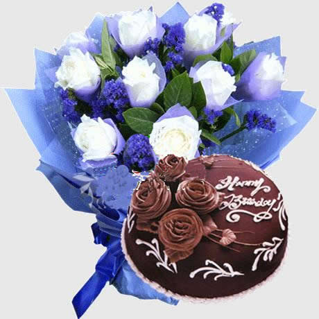 材料包裝: 「材  料」 鮮花:9枝白玫瑰,單枝包裝,內(nèi)襯紫色勿忘我和綠葉。蛋糕(8寸):巧克力,鮮奶油,蛋糕底。頂部四朵玫瑰裝飾,做成圓形 「包  裝」 鮮花:深紫色皺紋紙包裝,同色蝴蝶結(jié)束扎成圓形花束 。蛋糕:高檔蛋糕禮盒包裝。免費(fèi)送一次性蛋糕用品一套(刀、叉、盤(pán)、蠟燭)