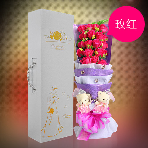 材料包裝: 19朵玫紅色香皂花花束 高檔禮盒包裝。