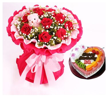 商品簡(jiǎn)介:11朵紅玫瑰+8寸蛋糕+小熊一只,粉色紅色卷邊紙包裝